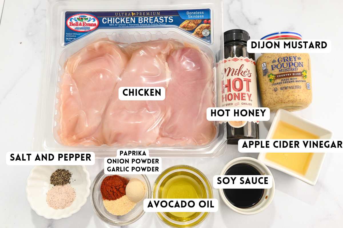 - Remove the chicken from basket and place in a bowl. Coat with the hot honey glaze ingredients and then air fry for an additional 1-2 minutes.3 tablespoon hot honey, 1 tablespoon soy sauce, 1 tablespoon apple cider vinegar, 1 teaspoon Dijon mustard