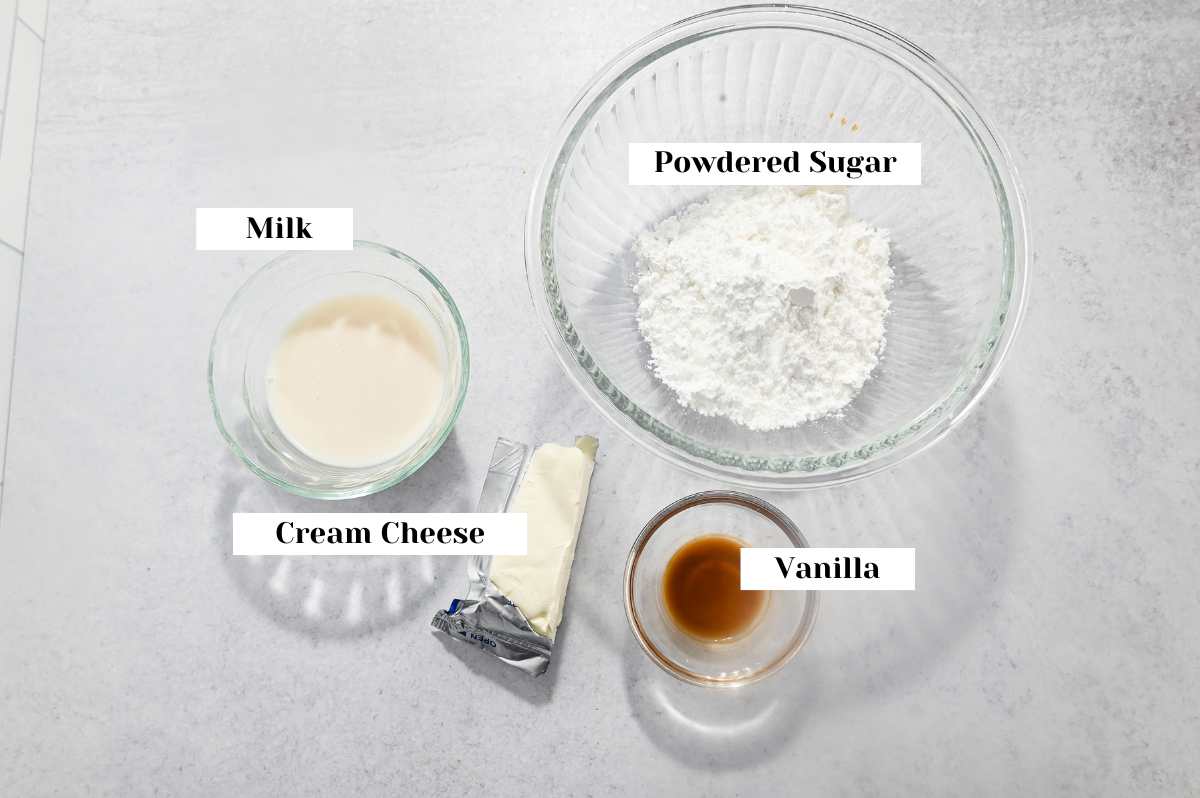 - Combine the frosting ingredients in a small bowl. Add 1 tablespoon of milk more if you want a thinner glaze-like frosting. Use a spatula to add the frosting to a Ziploc bag. Snip the end of the bag and then use it to drizzle the icing over the top of the cake.2 oz. cream cheese, ½ cup powdered sugar, ½ teaspoon vanilla, 1 tablespoon milk